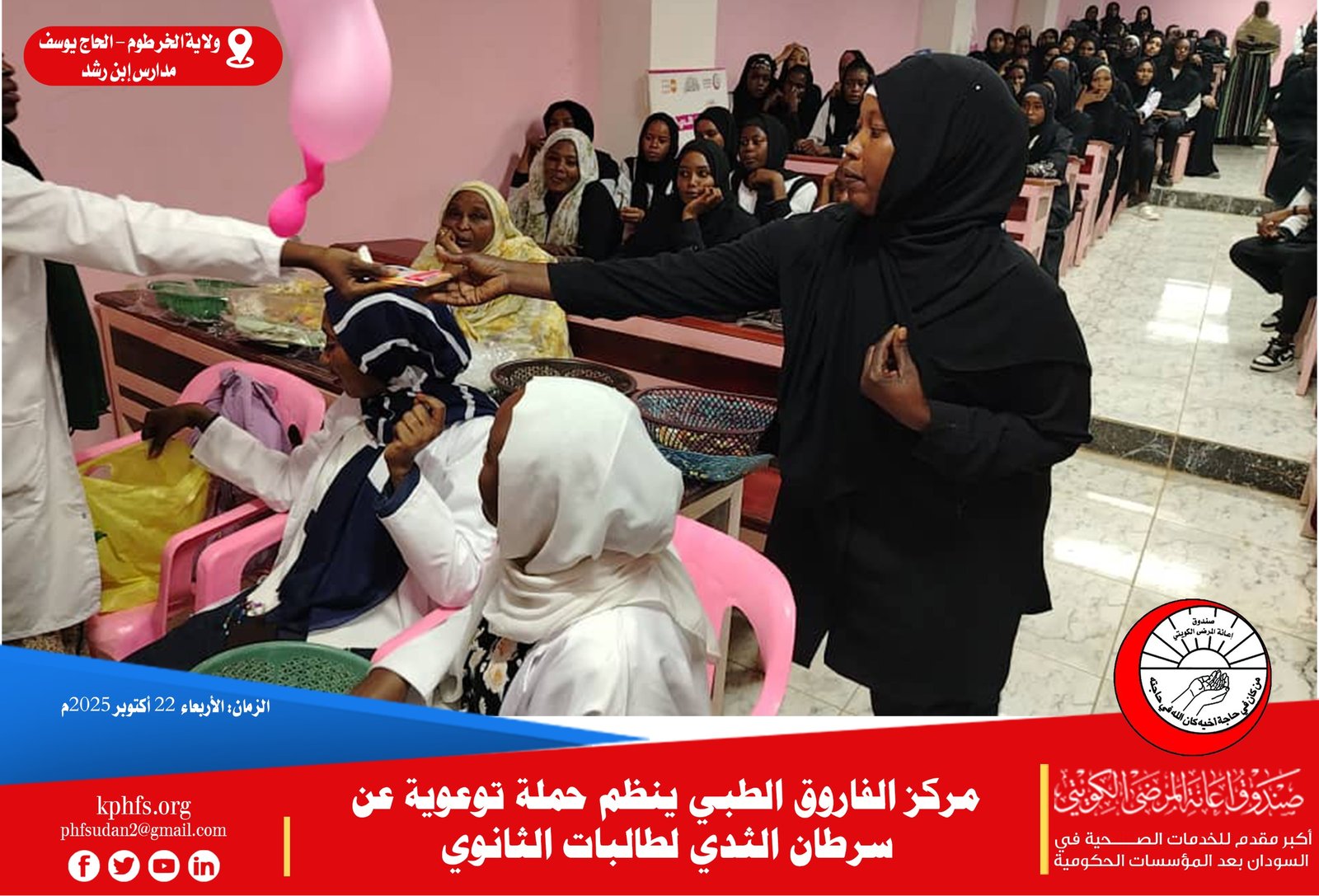في إطار الخطة التعاونية بين قطاعي الصحة والتعليم، وحرصاً على سلامة الطالبات خلال شهر التوعية العالمي بسرطان الثدي (أكتوبر الوردي)، نظَّم مركز الفاروق الطبي، التابع للمؤسسات العلاجية بصندوق إعانة المرضى الكويتي، أمس الأربعاء فعالية توعوية بمدارس ابن رشد الثانوية للبنات تحت شعار: (كوني واعية، قوية، وابدئي بنفسك).