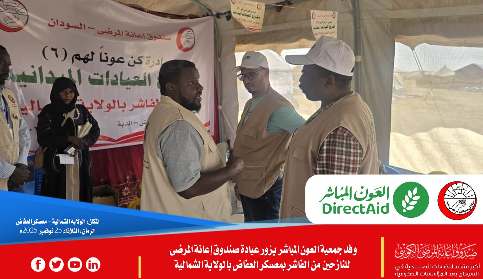 سجَّل وفد جمعية العون المباشر ظهر اليوم زيارة تفقدية لعيادة صندوق إعانة المرضى الميدانية المخصصة لتقديم الخدمات الصحية لنازحي مدينة الفاشر بمعسكر العفاض بالولاية الشمالية، وذلك في إطار تعزيز الشراكات الاستراتيجية وتطوير خدمات الرعاية الصحية المقدمة للنازحين.