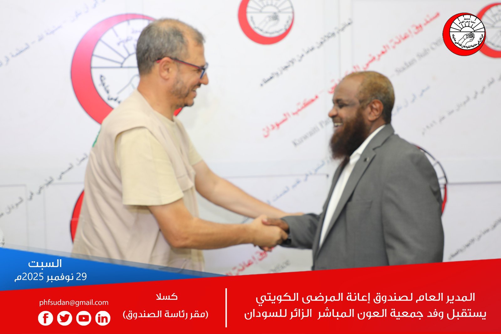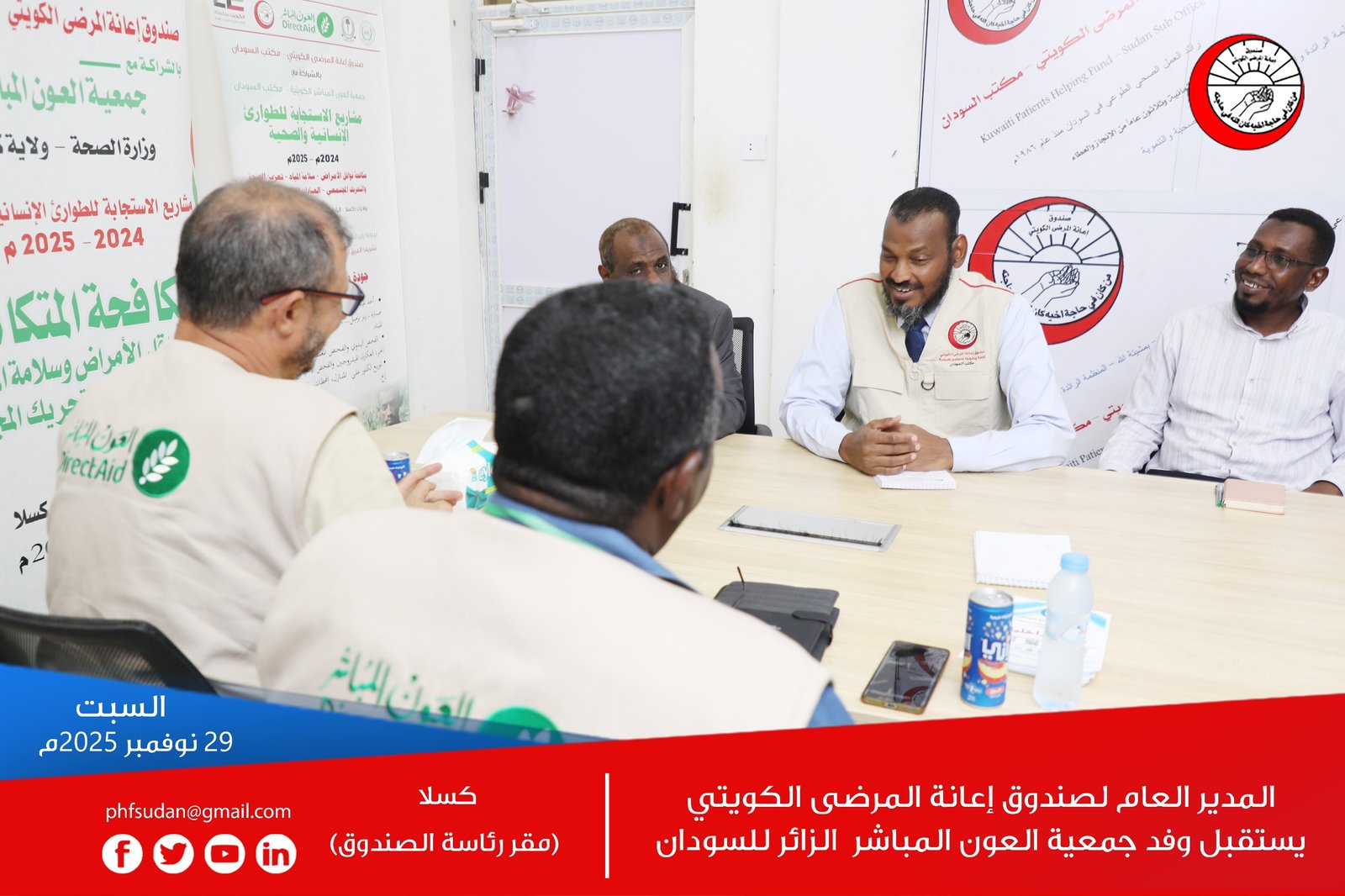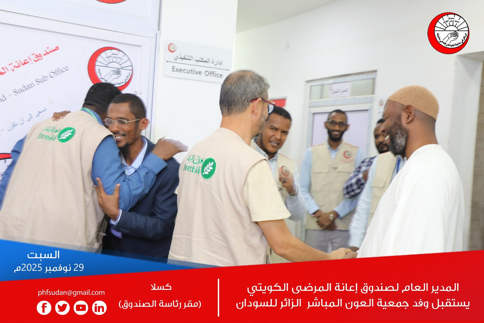 استقبل المدير العام لصندوق إعانة المرضى الكويتي ظهر اليوم السبت بمقر الصندوق بكسلا وفد جمعية العون المباشر الزائر للسودان، في زيارة تهدف إلى تعزيز التعاون الإنساني والصحي بين الجانبين.