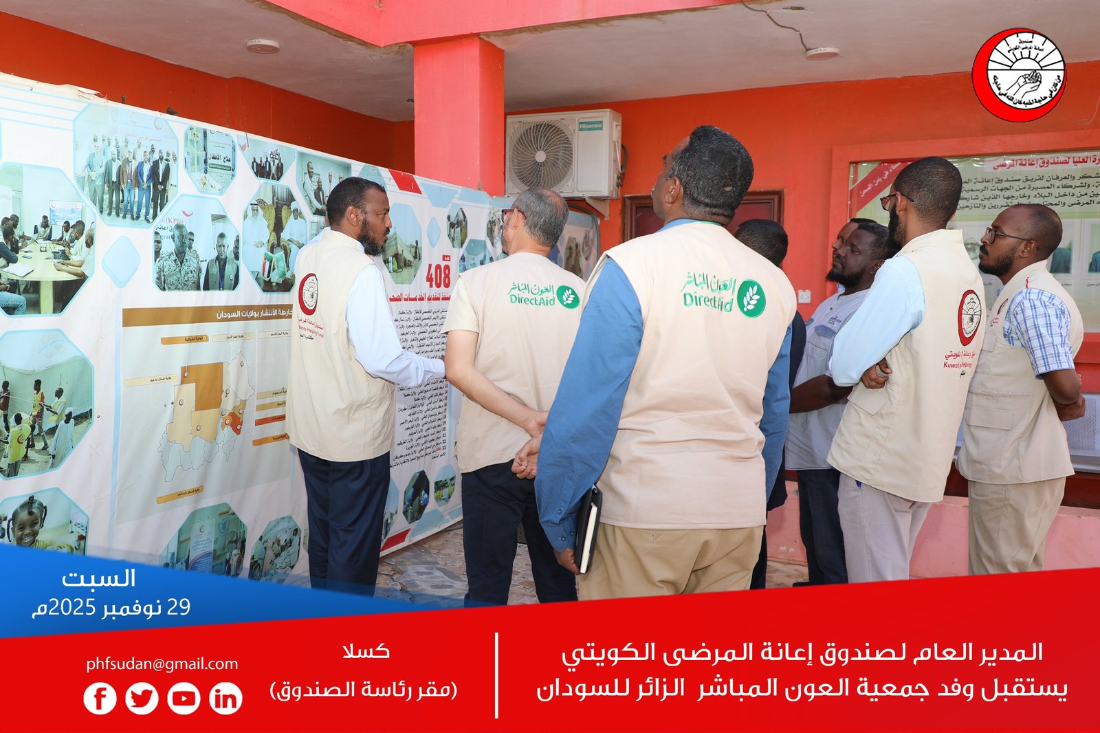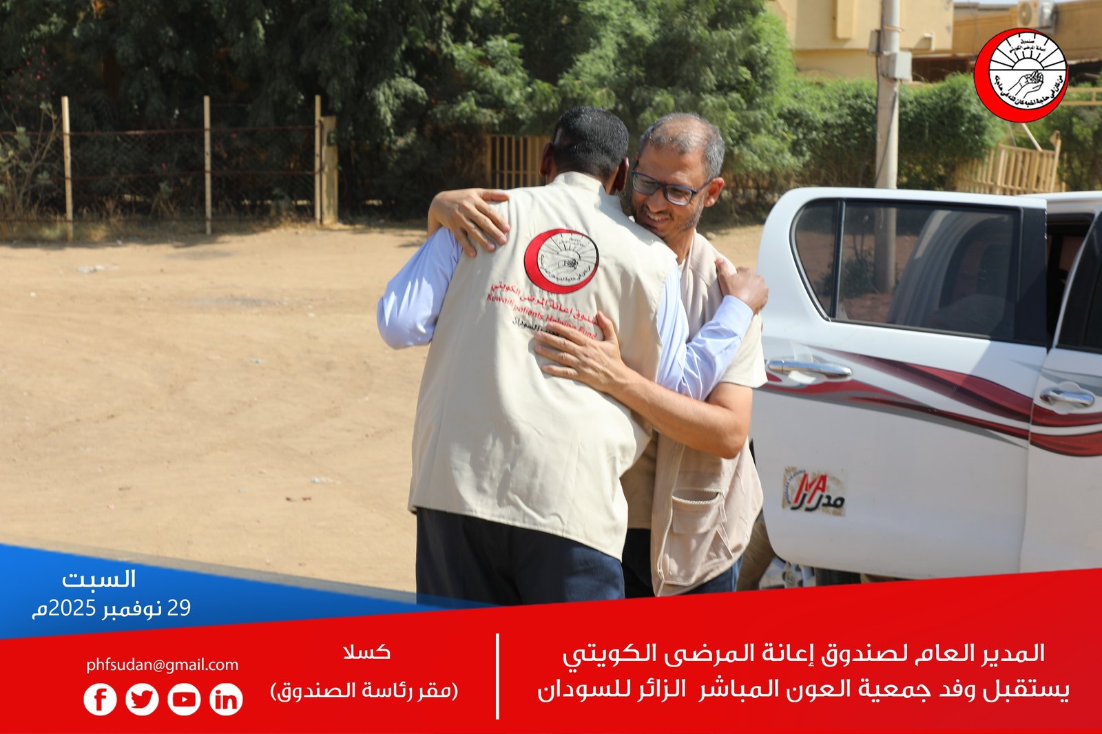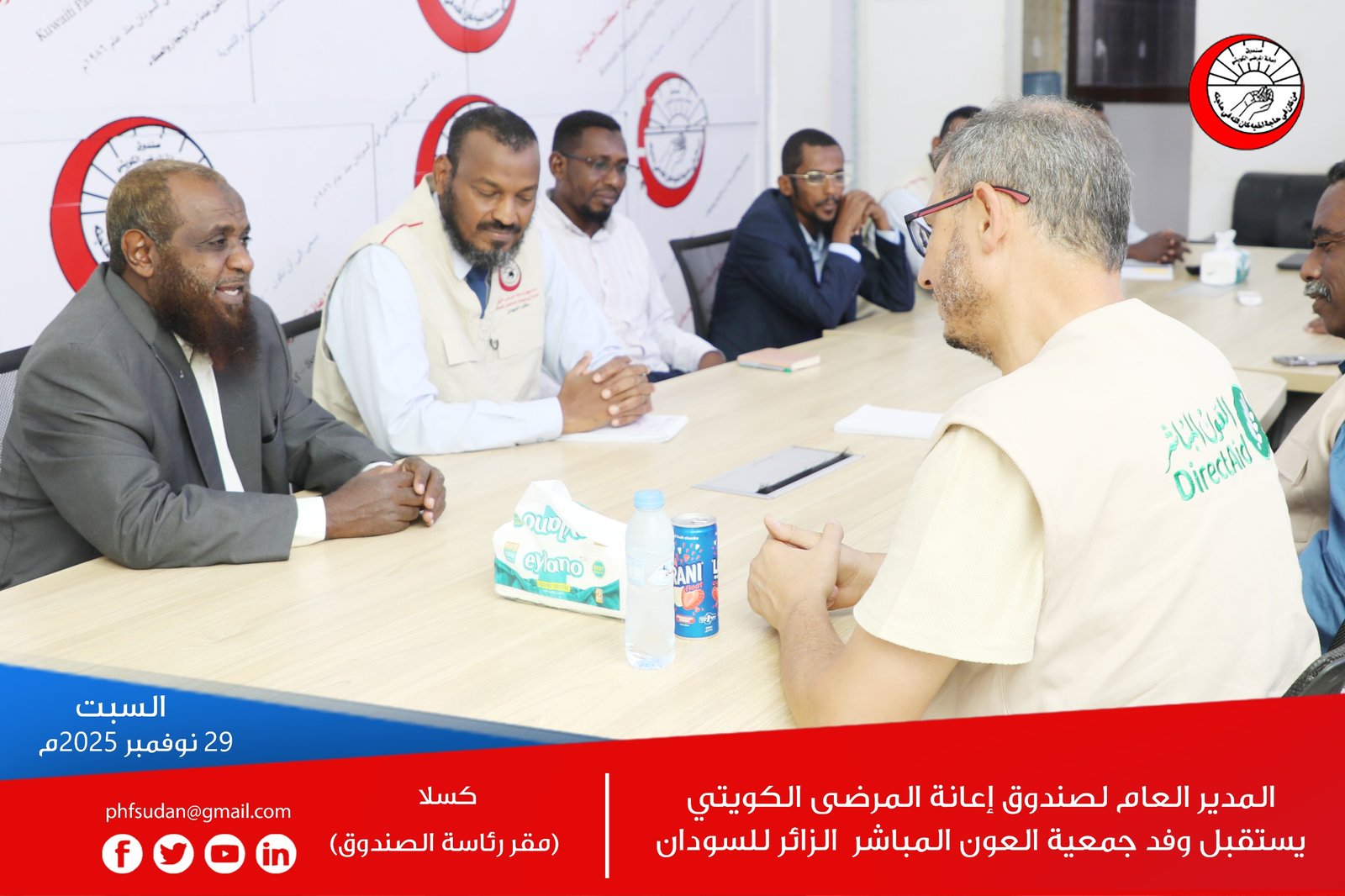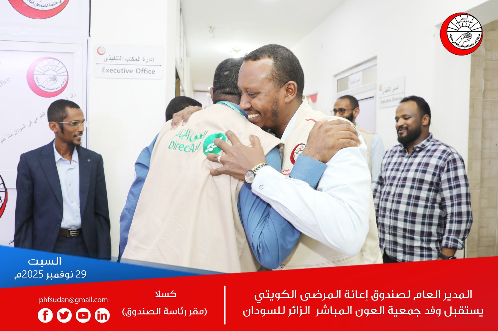 استقبل المدير العام لصندوق إعانة المرضى الكويتي ظهر اليوم السبت بمقر الصندوق بكسلا وفد جمعية العون المباشر الزائر للسودان، في زيارة تهدف إلى تعزيز التعاون الإنساني والصحي بين الجانبين.