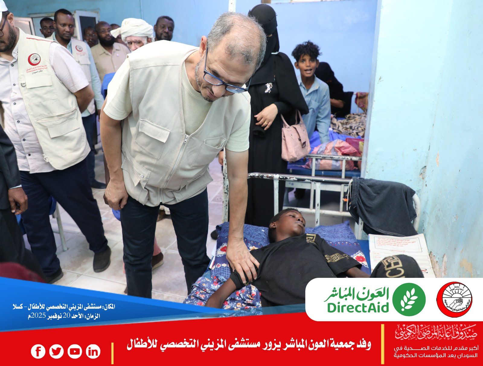 حيث قام الوفد صباح اليوم الأحد بزيارة مستشفى المزيني التخصصي للأطفال، بحضور د. كمال الدين يعقوب، المدير العام لصندوق إعانة المرضى الكويتي، ود. عبدالمجيد فضل الله، المدير التنفيذي، إلى جانب مدراء الإدارات. وشملت الزيارة جولة تفقدية في مختلف أقسام المستشفى للاطلاع على الخدمات الطبية المقدمة للأطفال ومتابعة احتياجات الأقسام المختلفة.